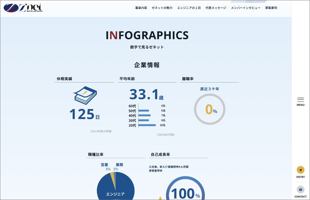 トップページのコンテンツでは、株式会社ゼネット様がこれまで社員の成長や働きやすさにこだわってきたことが伝わるように、インフォグラフィックという、グラフや画像を多様したデザインで、有給取得日数や成長率などを見せるブロックを提案いたしました。