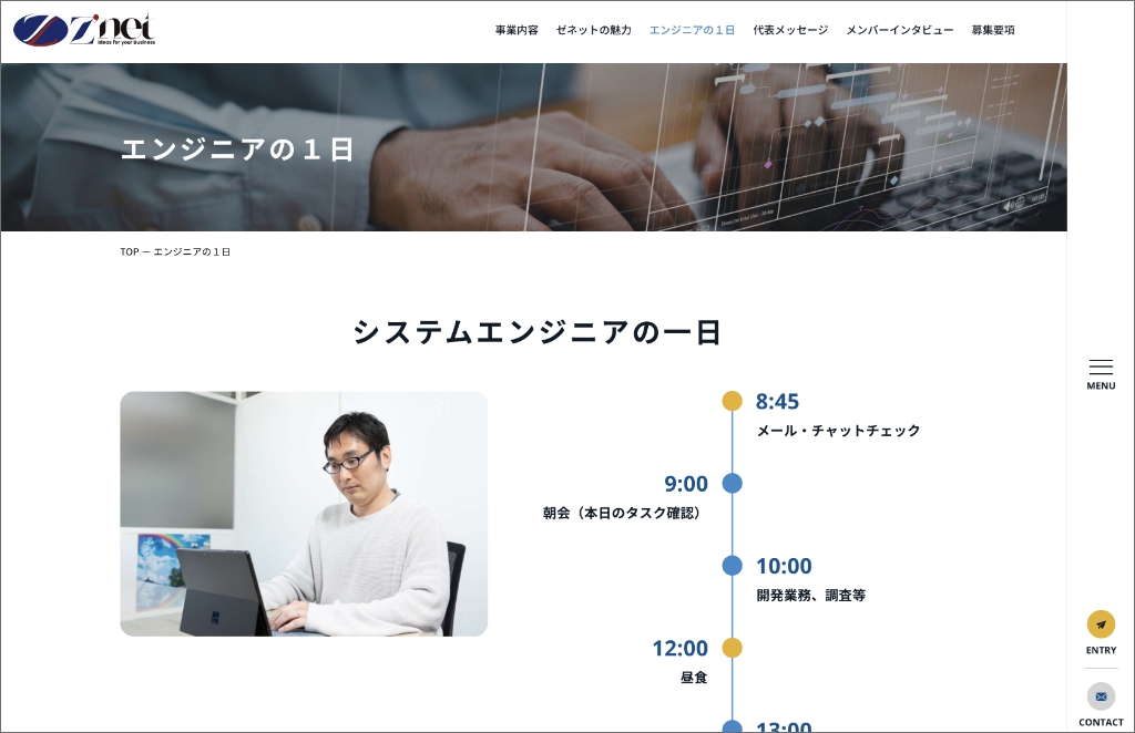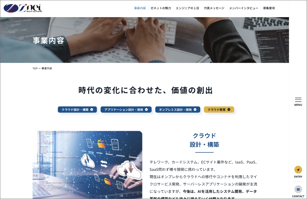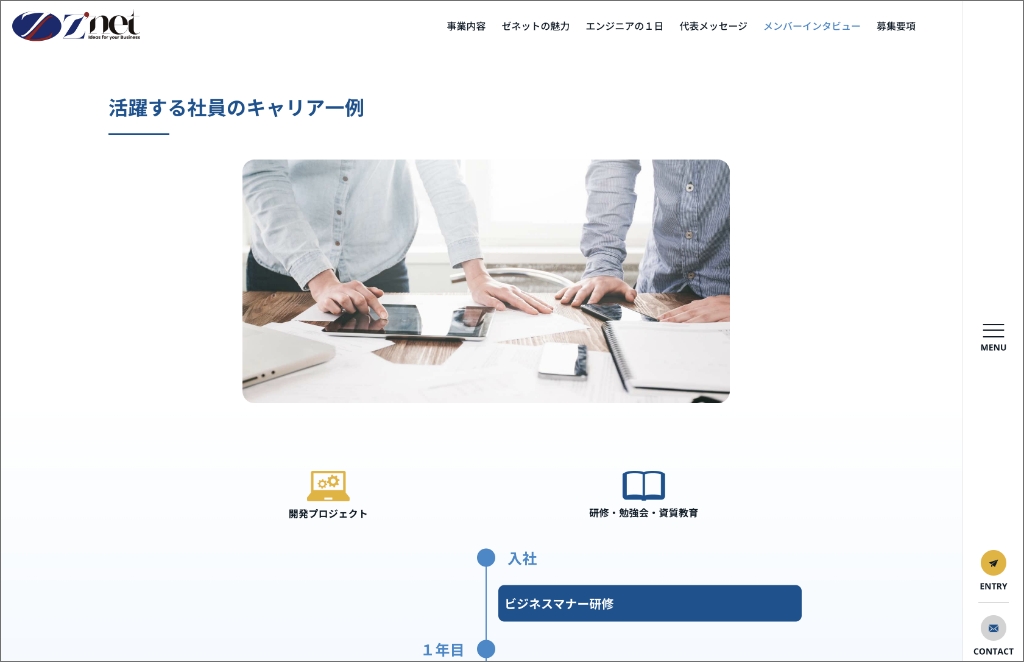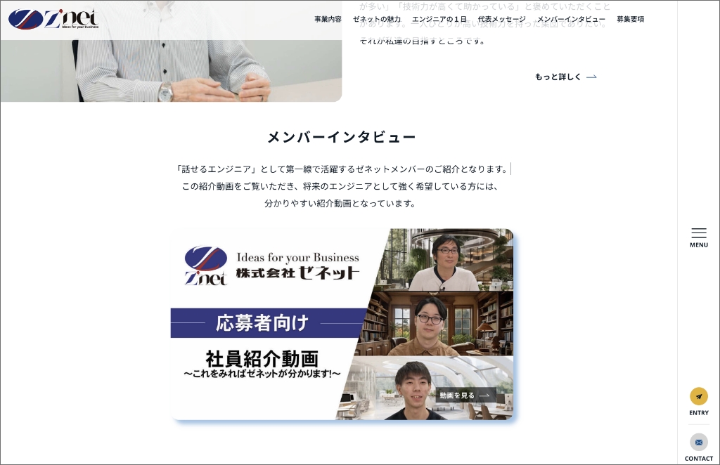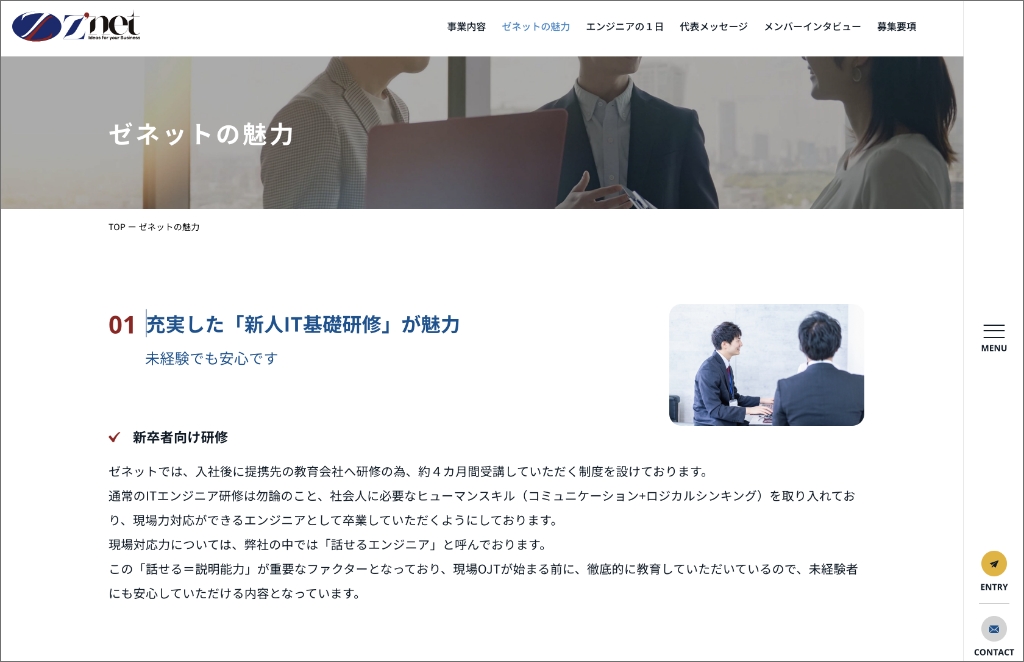 最初の画面では、株式会社ゼネット様の魅力がパッと伝わることを意識して、レイアウトとデザインを提案させていただきました。