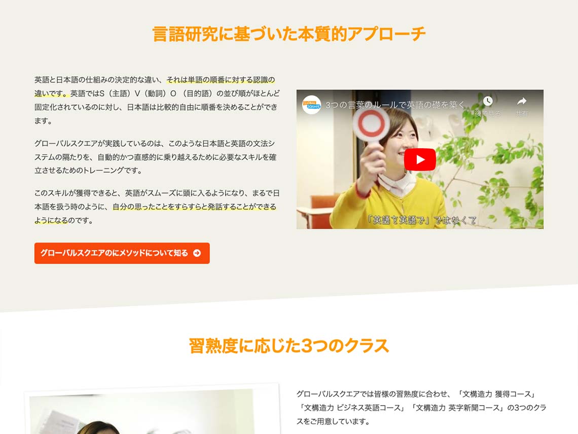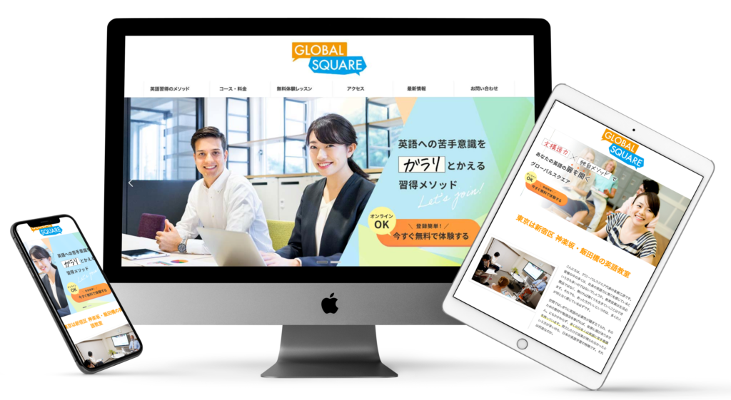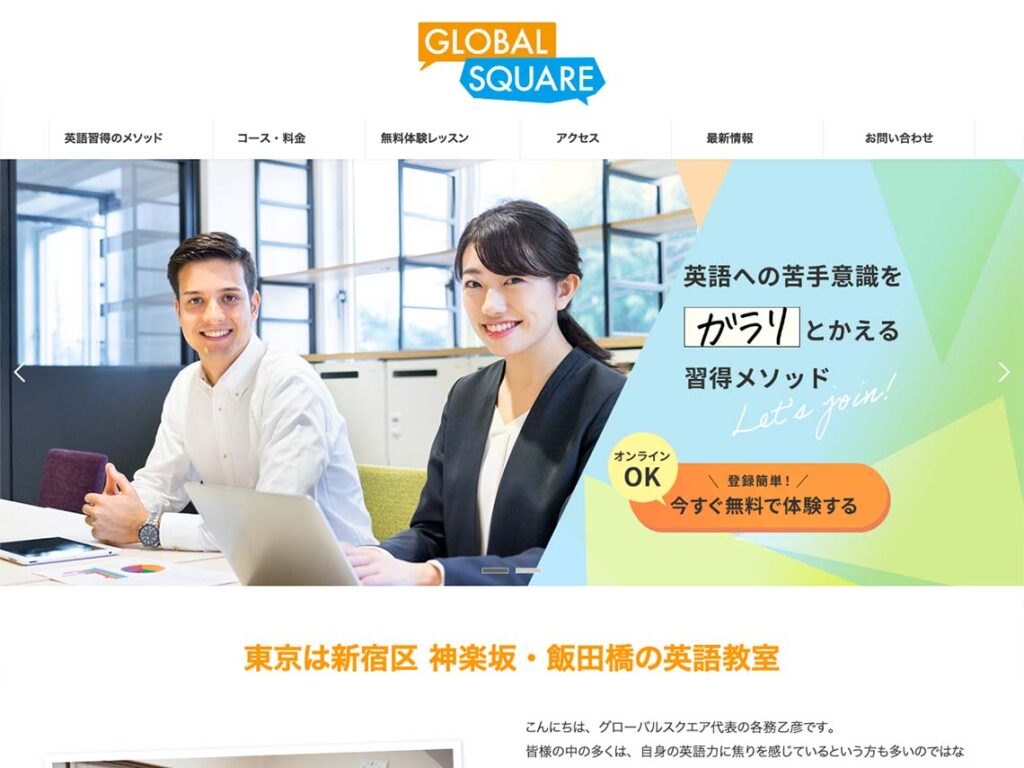 東京都飯田橋で英会話教室を営むグローバルスクエア株式会社様のWEBサイトをリニューアルしました。多くの人にグローバルスクエアのメソッドを知伝え、教室への新規申し込みを増やしたいというご要望をいただきました。