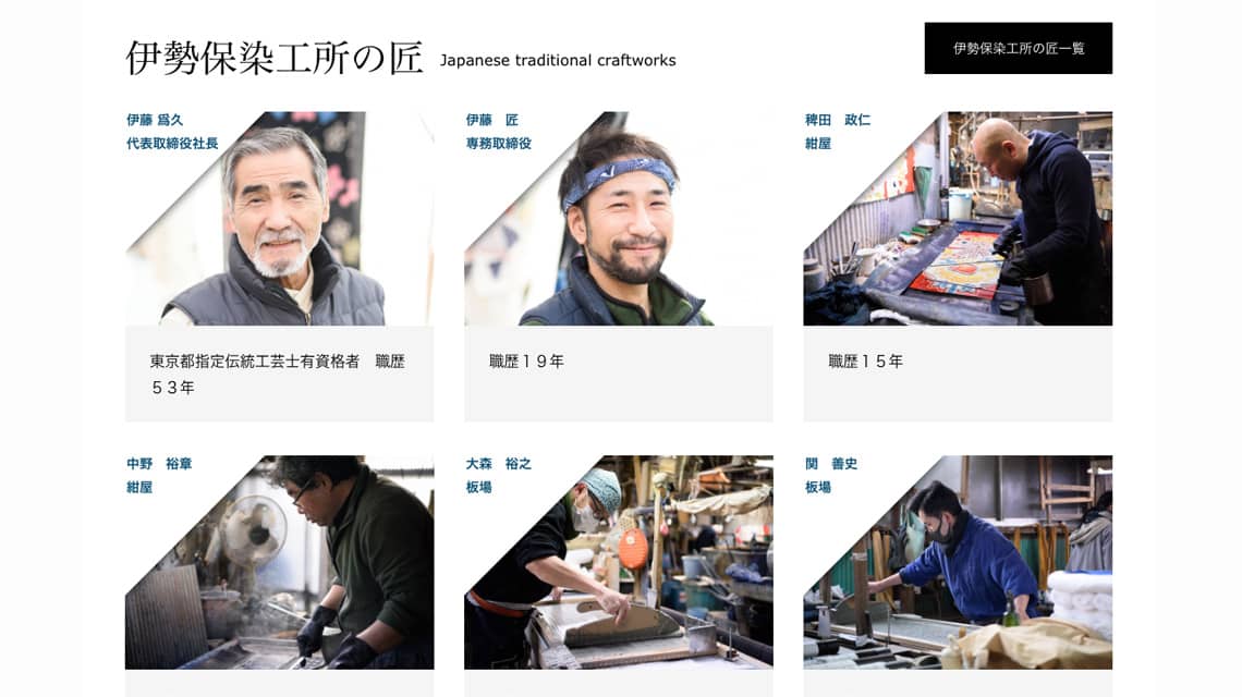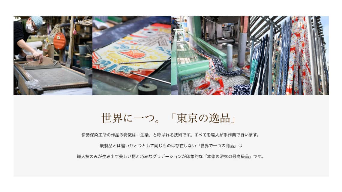 染め物の魅力、注染の魅力をを現代に伝える有限会社伊勢保染工所。今回は、その仕事や商品の魅力を伝えるため、新規で公式ウェブサイトを制作した。メインビジュアルに動画を用いることでデザイン性を高め、職人の仕事が見えるコンテンツを心がけた。また、様々な柄やカラフルな色付けが行われた制作事例の写真を新たに撮影し掲載することで、染め物の美しさや表現の豊かさを伝えるコンテンツとなるよう制作を行った。