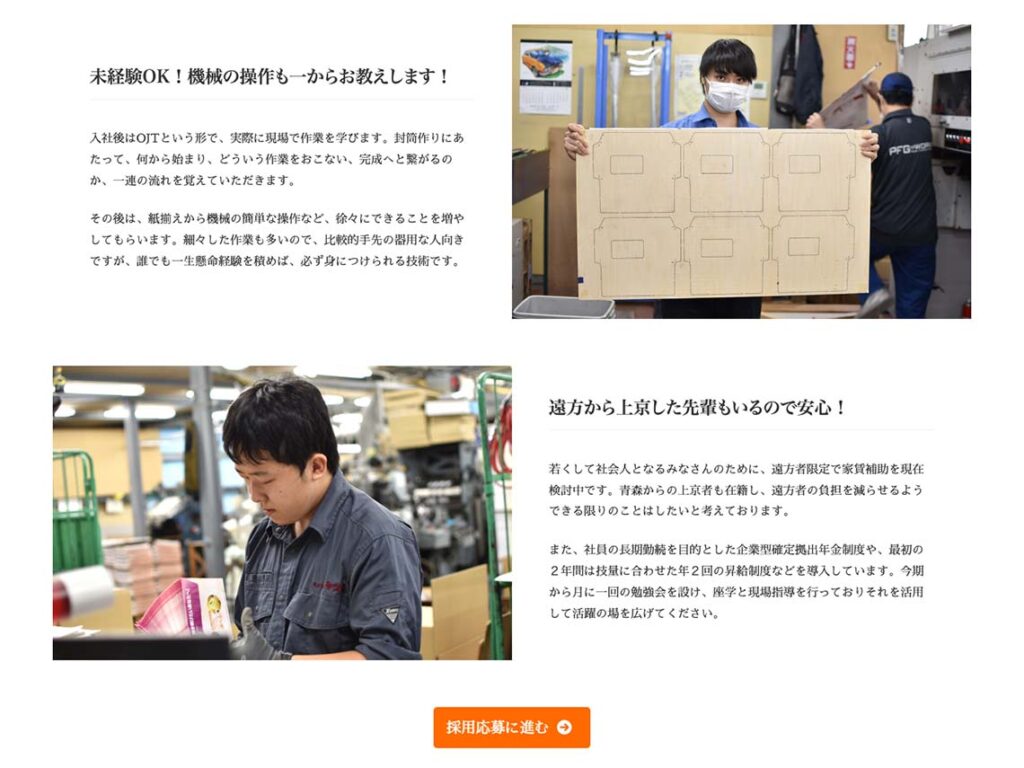 人材不足のために、若者からの採用応募が集まらないというお悩みをお伺いし、知識のない人でも封筒製袋加工の仕事を理解しやすいよう、封筒の種類に関する解説やや加工のプロセスに関する詳しい説明文を制作。写真を新規に撮影し、会社の雰囲気がわかるようなコンテンツを制作し、応募へのハードルを下げる工夫を凝らした。